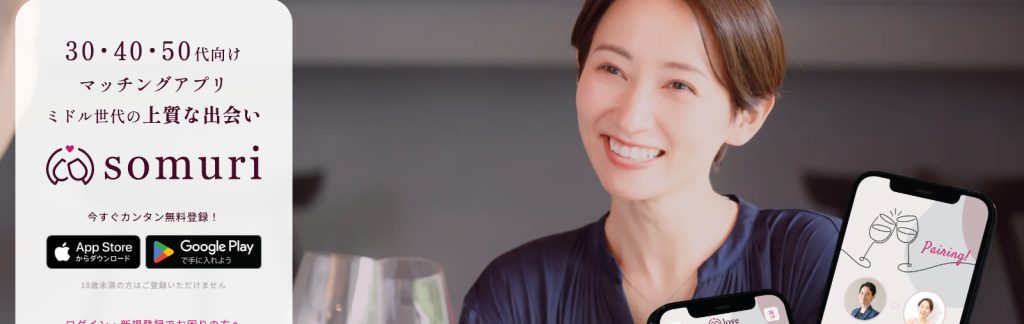 ソムリ(Somuri)は、30代から50代のミドル世代向けに特化したマッチングアプリ。ユーザーの性格や恋愛傾向を分析し、相性の良い相手を提案する機能があり。