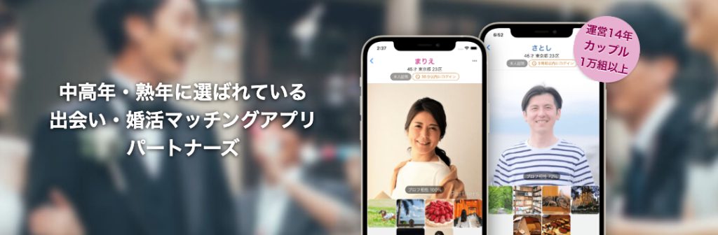 パートナーズは、2000万人以上の会員を誇り、業界内での会員数はトップクラス。主に40代から60代の中高年層を対象とした婚活マッチングアプリ。