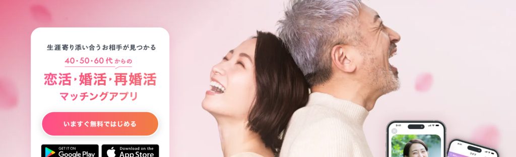 無理なく、自分のペースで出会いを楽しみたい50代・60代におすすめのアプリです。
