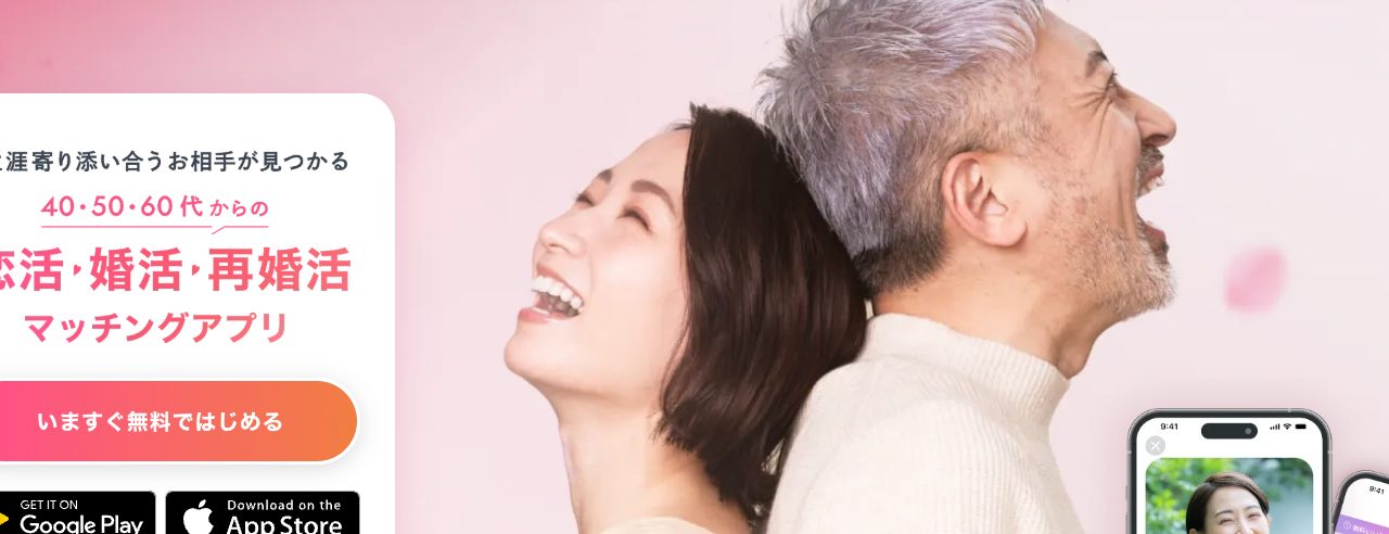 | 特徴 | 40代以上専用 ユーザーの80%以上が「結婚」や「再婚」を希望 |